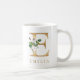 A personalized coffee mug with a faux gold letter "E" monogram, featuring decorative watercolor floral and foliage illustrations. Easily customize it with your name or create a unique gift for your loved ones.