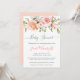 Elegant Baby Shower invitation features illustration of watercolor pink and peach roses contrasted with light greenish leaves.