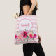 This pretty tote bag features your monogram, first name, watercolor flowers in shades of pale pink, cerise pink, fuchsia pink to marsala pink on pink lemonade and white stripes.