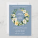 Watercolor Floral Wreath Yellow White Dusty Blue Wedding Invitation Card includes yellow roses, white flowers and botanical greenery.