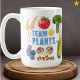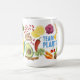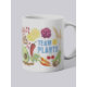 The person who uses this mug is a colorful vegetarian or vegan who is on 'TEAM PLANTS!!' There is a chaotic collage of watercolor fruits, vegetables, beans, nuts, and grains in a rainbow celebration of a plant based diet. Full of joy and energy, this design celebrates everything that grows from the earth, a meatless diet and your healthy life choices. There is corn, artichoke hearts, blueberries, wheat, walnut, corn, tomato, broccoli, red cabbage, lemon, ginger, beans, peas, carrots, avocado, garlic, ginger and cinnamon. And to top it off, a happy yellow sunshine! 100% happy, and 100% giftable!