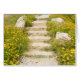 Watercolor garden with yellow flowers in blossom and stone stairs