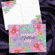 This Mother’s Day greeting postcard is a beautiful expression of love and appreciation. The postcard is adorned with a vibrant and colourful hand-painted floral design that immediately catches the eye. Large pink blooms and smaller purple flowers are intricately detailed, showcasing their natural beauty against a backdrop of soft pastel hues. The centre of the postcard features the heartfelt message “Happy Mother’s Day” written in an elegant black script font and a modern light pink font. This provides a stunning contrast to the vivid colours of the flowers, making the sentiment stand out.