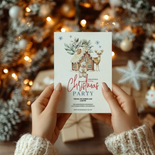 Watercolor Gingerbread House, Polar Bear & Reindee Holiday Card