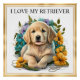 Gorgeous Watercolor Golden Retriever Puppy design with yellow, purple and blue flowers and gold frame
