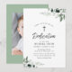 An elegant dedication invitation template with watercolor greenery foliage. The text, photo and colours can be edited.