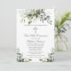 Modern Elegant First Holy Communion Invitation includes watercolor eucalyptus leaves and other beautiful botanical greenery foliage. Silver Cross.