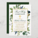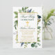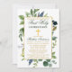 Elegant Watercolor Botanical Greenery First Holy Communion Invitation includes blue accents. Gold Frame. Gold Cross. Forest Green Back.