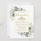 Modern Elegant Watercolor Botanical Greenery Wedding Quinceañera Invitation Card includes eucalyptus leaves, green botanical foliage, dusty blue leaves and other beautiful botanical greenery. Gold Frame. Sage Green Back.