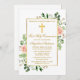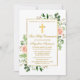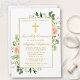 Modern Elegant Watercolor Pink Floral First Holy Communion Invitation includes pink roses, eucalyptus leaves and other beautiful botanical greenery foliage. Gold Cross.