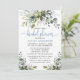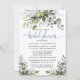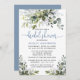 Modern Elegant Watercolor Botanical Greenery Bridal Shower Invitation Card includes eucalyptus leaves, green botanical foliage, dusty blue leaves and other beautiful botanical greenery. Dusty Blue Back. Trendy Calligraphy Script