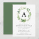 Elegant, botanical wedding invitation featuring your monogram initial encircled by a wreath of watercolor foliage in shades of spring and moss green. Personalise the boho greenery wedding invitation with your wedding details below. The modern botanical wedding invitation is perfect for spring and summer weddings.