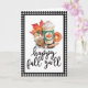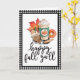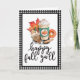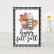 This folded card is perfect for anyone who looks forward to fall and all things pumpkin spice. The design features a watercolor image of a pumpkin spice drink with an assortment of fall goodies with the saying "happy fall y'all" below in a black hand lettering. There is a black and white gingham check border along the outside edge.