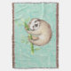 An adorable watercolor graphic features smiling sloth hangs from a branch on aqua and gold dot background