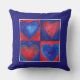 Decorative throw pillow features an original illustration of watercolor and gouache painted hearts in blue, red, and purple. The perfect accent for any room!