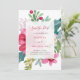 This beautiful and elegant Christmas wedding or winter holiday wedding save the date card features a trendy watercolor floral bouquet on a crisp white background. A mix of poinsettia flowers, holly berries, and leaves are coloured in festive shades of red, pink, green, blush, and blue. The back of the invitation is a colourful, pinkish red.