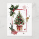 A beautiful, hand-painted watercolor design featuring a lush green Christmas tree decorated with red ornaments and topped with a gold star, sitting in a festive gift box tied with a red ribbon. The elegant white frame is accented with classic holly and red berries, creating a modern, yet traditional look.