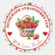 Watercolor red and green strawberries in a basket design with strawberry background and red text