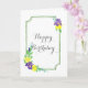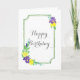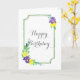 Beautiful hand painted watercolor irises and daffodils adorn this Happy Birthday greeting card.