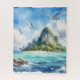Mysterious island in the middle of the ocean surrounded by seagulls. And are those houses I see on the edge of the jungle? In the style of a watercolor painting.