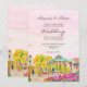 Watercolor Kiosk with Florals in Old Mexico Scene evokes the vibrant heart of a Mexican town plaza, where tradition, romance, and artistry meet. This wedding invitation features a charming hand-painted gazebo surrounded by lush blooming bougainvillea, golden trees, and pastel-toned buildings, all set beneath a soft pink sky. The kiosk, or kiosco, becomes a romantic centerpiece—symbolising community, celebration, and timeless love.