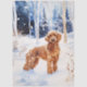 Cosy watercolor painting of a Labradoodle standing in snowy woods with falling snow.