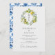 This elegant wedding invitation features a delicate watercolor lemon wreath encircling the couple’s initials, creating a fresh and romantic Mediterranean-inspired design. The soft botanical greenery and vibrant yellow lemons bring a charming, rustic touch, perfect for a garden, vineyard, or summer wedding. The classic serif typography paired with graceful script adds a timeless and sophisticated feel, ensuring a refined presentation. The reverse side showcases a stunning blue and white watercolor Mediterranean tile pattern, inspired by traditional European tilework, adding an extra touch of artistic charm. Ideal for couples seeking a stylish yet natural theme, this invitation sets the perfect tone for a joyful and elegant wedding celebration. Available as printed cards or an instant digital download.