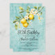 Elegant watercolor lemon-themed 80th birthday invitation with a floral illustration and a teal background. Personalise the text with the party details.