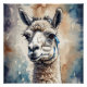 A Llama with detailed watercolor with expressive eyes is portrayed against a soft, blurred background. The natural colours enhance the lifelike appearance.