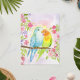 This hand-painted watercolor and pen illustration features lovebirds perched on a branch, surrounded by soft pink and purple flowers against a romantic pink sunset.