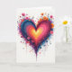 This greeting card features a large heart in the center on a white background, painted with wide, swirling strokes. The heart glows from a yellow middle and shifts outward through orange, red, hot pink, purple, and then deep blue along the edges. Around it are small, simple flowers in pink, orange, and purple, plus thin dark stems that look like they’re growing from the heart. You’ll also see scattered paint dots and drips that run down and out from the heart, giving it an energetic, artsy look. The heart feels warm and hopeful, like a big burst of affection ❤️.