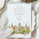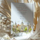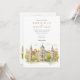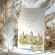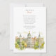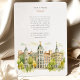 Celebrate your special day with this exquisite wedding invitation, showcasing the iconic architecture of Madrid, Spain. The front presents a picturesque view of the city, with its elegant buildings, domes, and towers, rendered in a soft, artistic watercolor style. Lush greenery frames the scene, adding a touch of natural beauty.