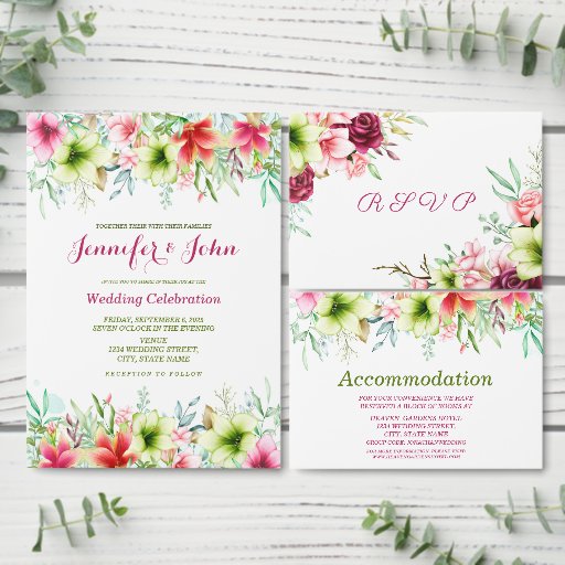 Watercolor Magenta Red Amaryllis Floral Wedding Invitation