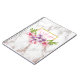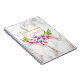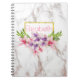 A personalised spiral notebook with an elegant design - a faux marble texture in white makes up the background. Layered over top is a frame with a faux gold foil border. Large pink and purple watercolor magnolia flowers with green leafy accents decorate the design.
