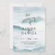 Modern wedding invitation, featuring a landscape of teal watercolor misty mountains