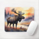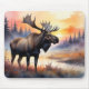 This serene watercolor painting captures a majestic moose standing gracefully at sunrise, bathed in warm golden hues. The soft brushstrokes and misty atmosphere create a peaceful, nature-inspired scene perfect for wildlife and landscape art lovers.
