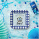 This adorable pattern features a watercolor nativity on a light blue background with white and blue plaid border. Says "Happy Birthday, Jesus!"