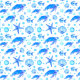 Blue Watercolor Nautical Pattern - Turtles and Seashell Fabric. Sea Animals Pattern.