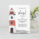 This design features a simple watercolor nautical coastal, a coast beach seaside rehearsal dinner, great for summer ocean sea water seashore parties, a whimsical fun celebrate lighthouse, with stylish trendy calligraphy script, a cute colourful red black white, a simple minimalist minimal typography, with waves water sand shore sea, an ocean sea grooms dinner invitation
