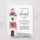 This design features a simple watercolor nautical coastal, a coast beach seaside rehearsal dinner, great for summer ocean sea water seashore parties, with a QR code for Facebook event URL, a whimsical fun celebrate lighthouse, with stylish trendy calligraphy script, a cute colourful red black white, a simple minimalist minimal typography, with waves water sand shore sea, an ocean sea grooms dinner invitation