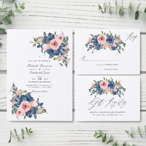 Trendy blush pink and navy blue floral wedding table number cards customisable to your event specifics.