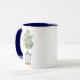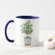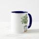 Coffee mug featuring a watercolor illustration of an olive tree with lush olive branches scattered throughout image. The tree is set in a blue and white planter. Image printed on both sides. Additional sizes and rim and handle sizes available.