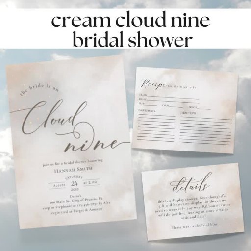 This elegant and whimsical invitation is perfect for the new theme "on cloud 9." It features a watercolor cloud background, and script swirly text.