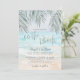 Simple Seaside Watercolor Summer On The Beach Wedding Invitation. The background flows softly from the sky down to the ocean water and sandy shoreline, with the beach set at a slight angle for a modern coastal feel. The artwork keeps a gentle, slightly abstract look as the waves meet the sand. Palm leaves sit at the top above the horizon, adding a light tropical touch without overwhelming the design.