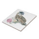 This design features a watercolor portrait of an owl posing in a hat and pink roses.