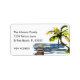 A tropical watercolor palm tree leans out over the water on this southern/Florida themed change of address label. The scene also includes a wooden dock, typical of homes on intracoastal waterways. Text is customisable for your personal greeting and contact details. Matching postcard and postage stamp are also available.