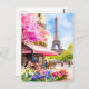 A gorgeous watercolor travel postcard capturing the essence of Paris in bloom. This vibrant illustration features the Eiffel Tower, a charming street café, and colourful flowers. Perfect for travelling, collecting, or sending notes to friends. A beautiful, impressionistic fine art print that evokes the romance of the City of Love.