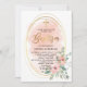 Elegant modern watercolor girl Baptism invitation featuring trendy gold oval geometric frame ,watercolor background and peach flower arrangement. To edit this template please click customize further.