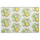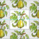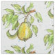 An elegant fruit fabric decorated with a golden pear ripening on a leafy branch sketched with sepia ink and watercolor in warm shades of green on a spatter accented background.