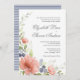 Watercolor peonies and blue berries and greenery frame the text in this unique wedding invitation design.
